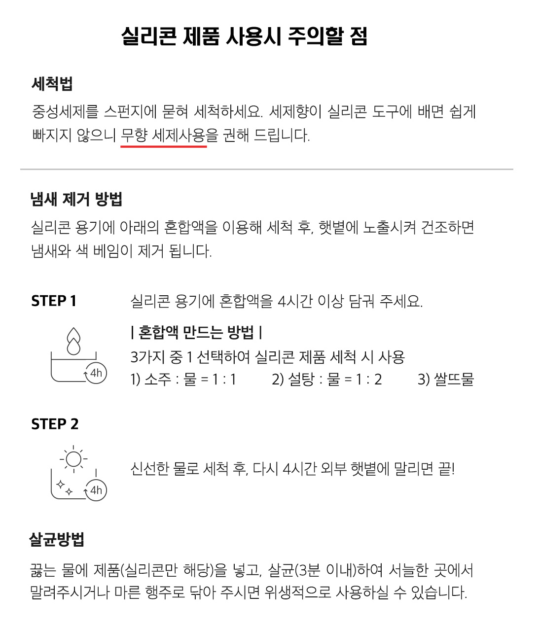 끓는 물에 제품을 넣고 살균하여 서늘한 곳에서 말려주시거나 마른 행주로 닦아주시면 위생적으로