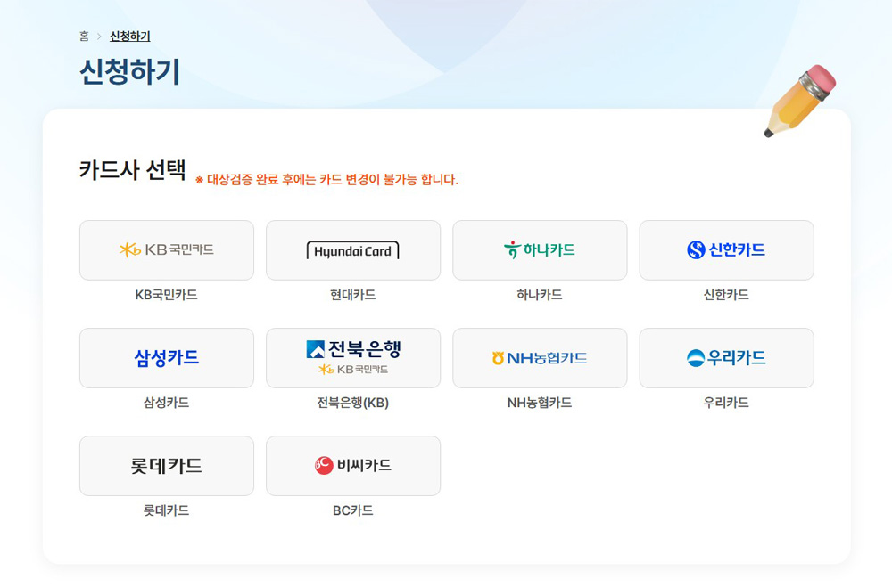 본인이 사용할 카드사를 선택해서 신청하시면 됩니다.